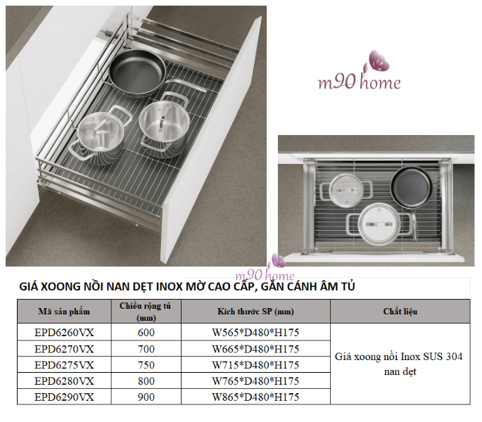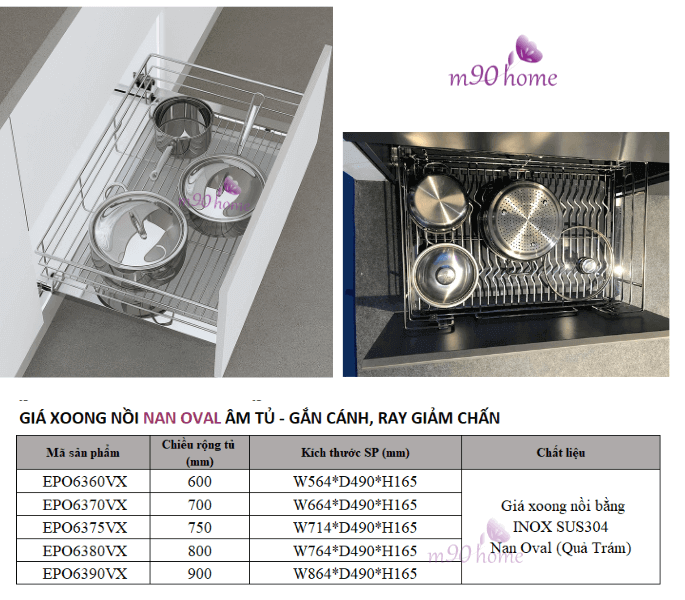 - Kích thước giá kệ để xoong tương ứng: 565, 665, 715, 765, 865 mm