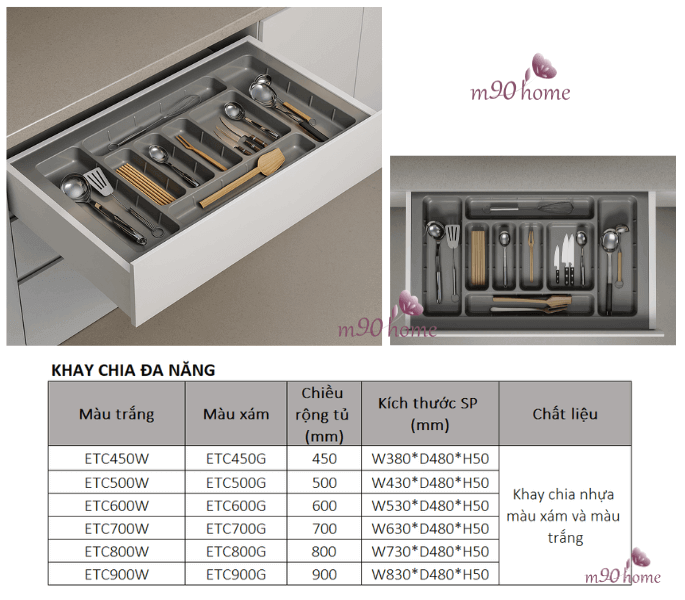 Với nhiều kích thước và chất liệu khác nhau, khay có thể phù hợp hầu hết tủ bếp tiêu chuẩn từ 450mm – 900mm.