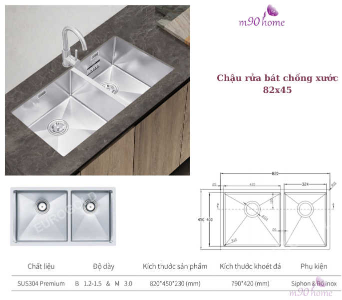 M90home giới thiệu top 5 bồn rửa chén bát 2 ngăn lắp âm cao cấp chống trầy xước đến từ thương hiệu Eurogold – phụ kiện tủ bếp Inox cao cấp. Các mẫu chậu được thiết kế hiện đại, chất lượng, dễ vệ sinh, là mẫu chậu rửa nên có trong không gian nhà bếp gia đình.